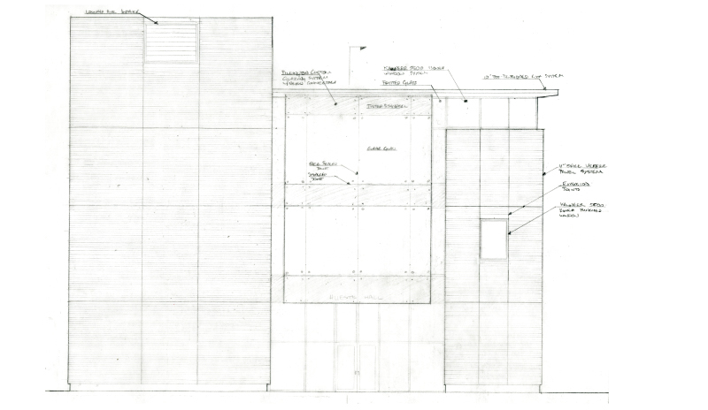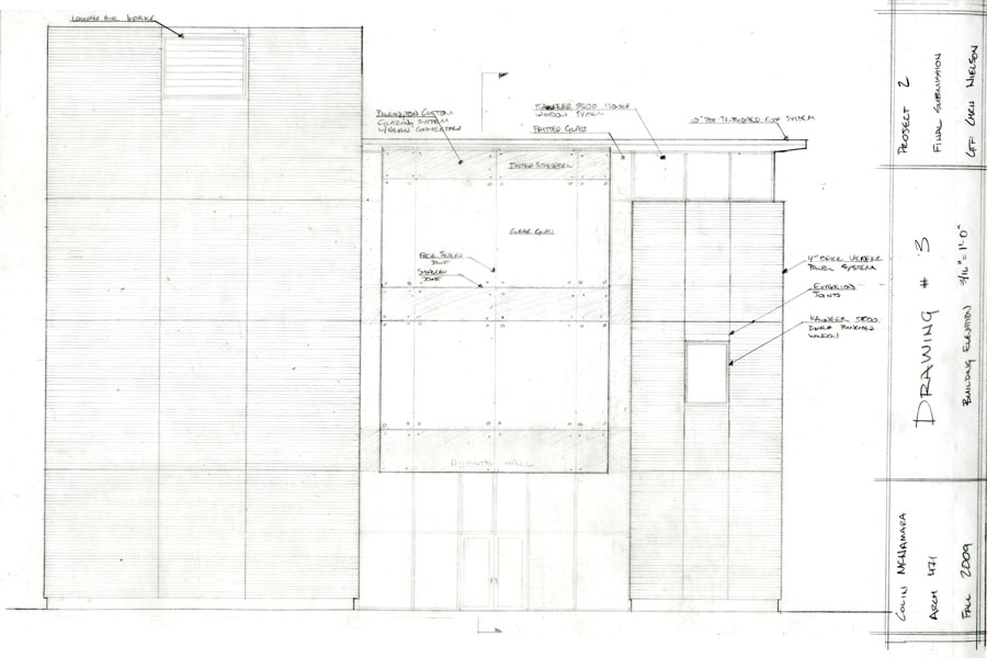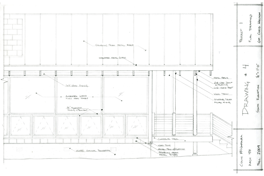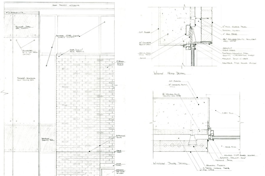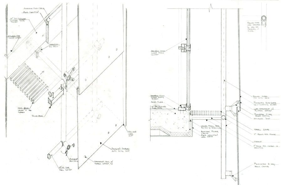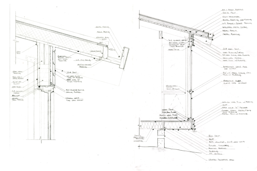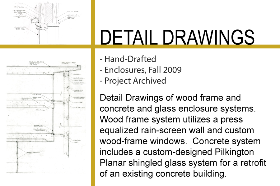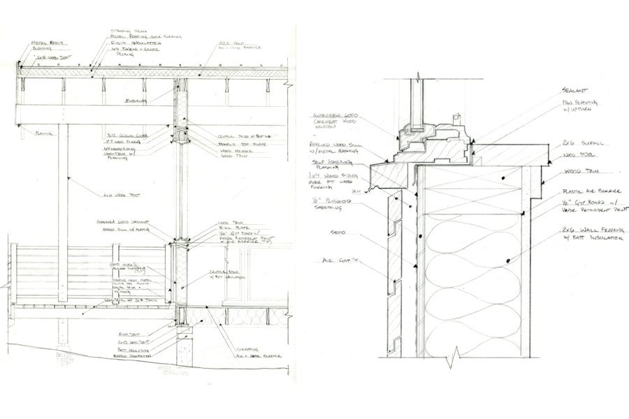 Detail drawings of wood frame and concrete and glass enclosure systems.